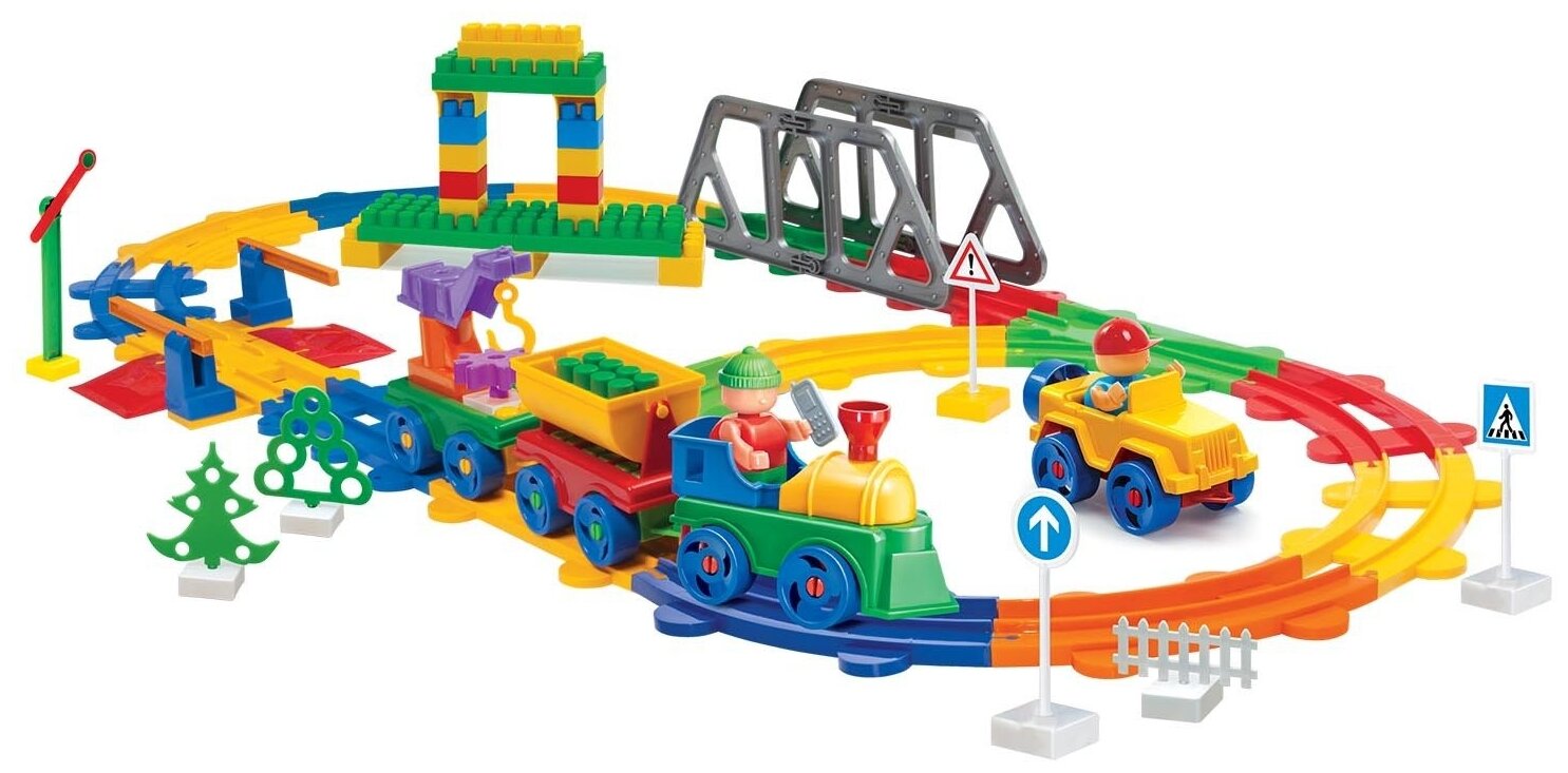 Лучшие цены. Серия блочного конструктора для детей от 3х лет, посвященная поездам и железным дорогам. Детали конструктора изготовлены из пластика и безопасного красителя, сочетаются с другими наборами от Bauer. В комплекте: фигурки человечков, сборные машинки раличных конфигураций, сборные поезда и вагоны в ним, элементы дорожного полотна, набор инструментов, набор наклеек "Дорожные знаки", элементы декора (дорожные знаки, шлагбаумы, деревья, светофоры,забор, окна, двери, крыши, опоры моста). Магазины в вашем городе.