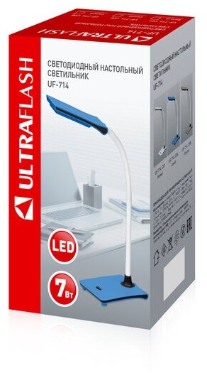 Лучшие цены. Настольная лампа Ultraflash UF-714 поможет создать дополнительное освещение на рабочем месте дома или в офисе. Прибор лёгкий и компактный, поэтому не займёт много места, обеспечивая при этом комфортные условия. долговечность Эта модель снабжена встроенными светодиодами, которые не придётся часто менять. Срок их службы — 30000 часов. Питание лампа получает от электросети. Магазины в вашем городе.