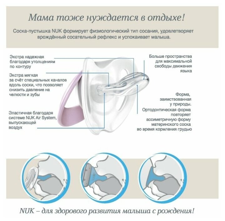 Лучшие цены. Соска-пустышка NUK Space имеет оригинальную форму, способствующую здоровому развитию челюсти. Изготовлена из высококачественных синтетических материалов (силикон, полипропилен). Пустышка экстрамягкая за счёт специальных каналов вдоль соски, что позволяет снизить давление на зубы и челюсти ребёнка. Соска обеспечивает много пространства для совершения языком естественных сосательных движений и, таким образом, тренирует координацию движений губ, языка и челюсти. Магазины в вашем городе.