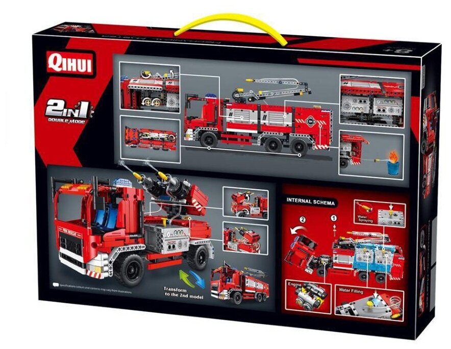 Лучшие цены. Конструктор QiHui Technic Пожарная машина 2в1 (1288 деталей, стреляет водой, пульт) - QH6805 – это необычный набор, который понравится как ребенку, так и взрослому. Из его элементов вы можете создать уникальные модели, которые стреляют водой! Желаем увлекательной сборки и приятной игры! Перед работой изучите руководство по сборке. Подробные схемы помогут вам избежать ошибок. Из множества деталей соберите красочную мощную машину. Внимательно рассмотрите ее. Спереди вы видите вместительную кабину. Магазины в вашем городе.