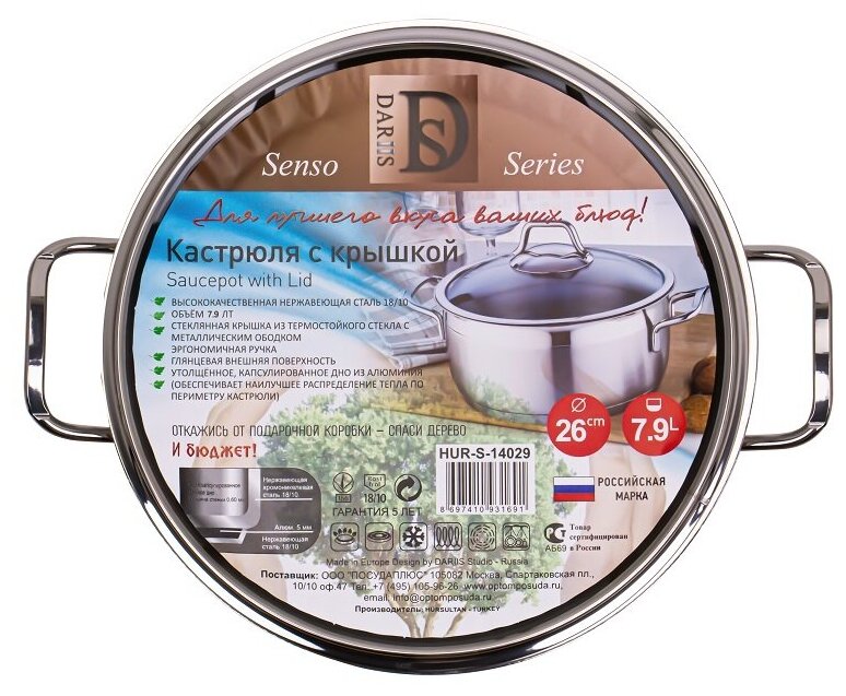 Кастрюля Кастрюля для индукционной плиты 7,9 литра 26 см со стеклянной крышкой DARIIS SENSO из нержавеющей стали Турция HUR-S-14029