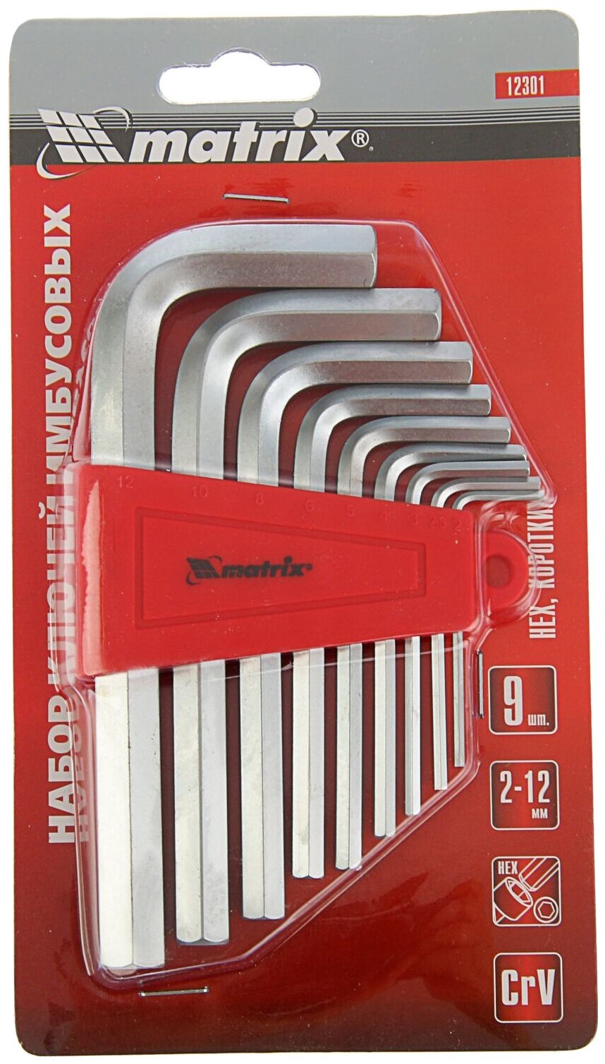 Набор ключей имбусовых HEX, 2-12 мм, CrV, 9 шт, короткие с сатинированным покрытием Matrix 12301