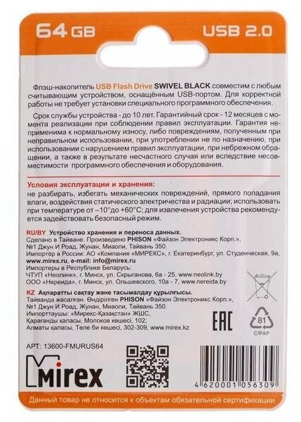 Флешка 64GB Mirex Swivel 13600-FMUSWT64