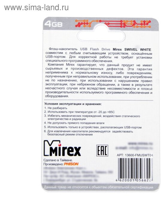 Накопитель USB 2.0 4GB Mirex SWIVEL 13600-FMUSWT04 белый (ecopack)