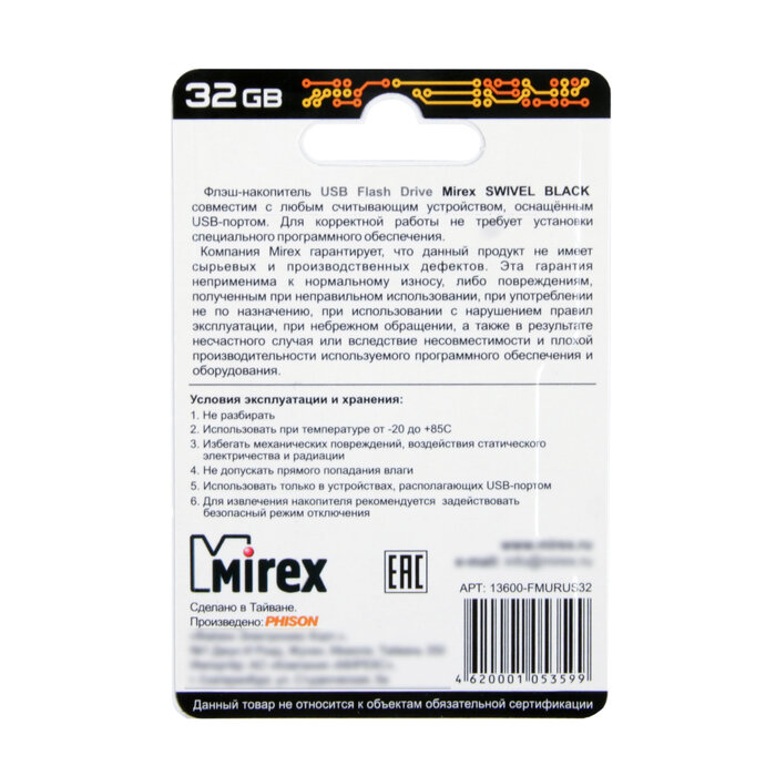 Лучшие цены. Флешка Mirex SWIVEL BLACK, 32 Гб, USB2.0, чт до 25 Мб/с, зап до 15 Мб/с, черная подойдёт для тех, кому необходимо иметь съёмный носитель для хранения и перемещения данных различных форматов. Магазины в вашем городе.