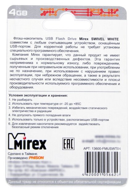 Накопитель USB 2.0 4GB Mirex SWIVEL 13600-FMUSWT04 белый (ecopack)