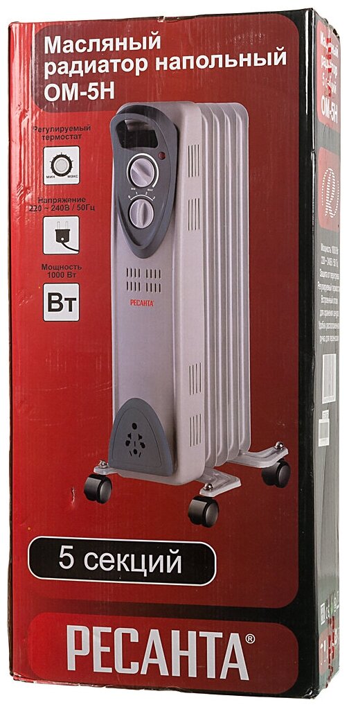 Лучшие цены. Масляный радиатор Ресанта ОМ-5Н используется для обогрева помещений. Прибор имеет три режима нагрева, которые переключаются при помощи удобной ручки. Радиатор оснащен термостатом, что позволяет ему автоматически поддерживать в помещении заданную пользователем температуру. Для удобства перемещения прибор оснащен колесами. Магазины в вашем городе.