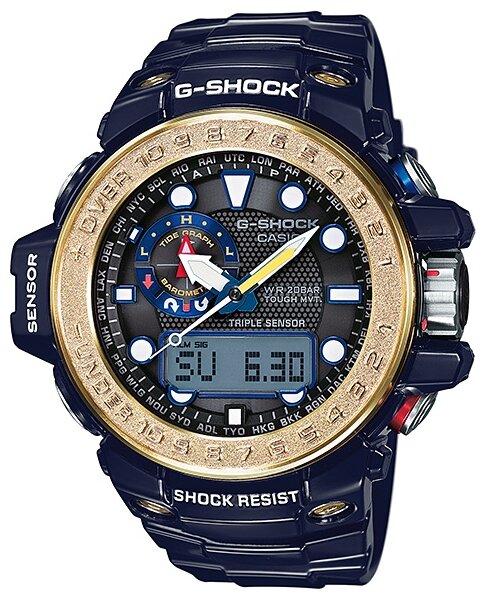 Лучшие цены. Мужские наручные часы Casio G-Shock GWN-1000F-2A Gulfmaster. Общие характеристики. Тип: кварцевые, мужские. Способ отображения времени: аналоговый + цифровой, формат 12/24 часа, секундная стрелка центральная. Цифры: отсутствуют. Источник энергии: от солнечной батареи. Противоударные: есть. Водонепроницаемые: есть, WR200 (20 атм). Материал корпуса: нерж. сталь + пластик. Материал браслета/ремешка: пластик. Стекло: минеральное. Габариты (ШхВхТ): 55.8x44.9x16.2 мм. Вес: 101 г. Радиосинхронизация: есть. Магазины в вашем городе.