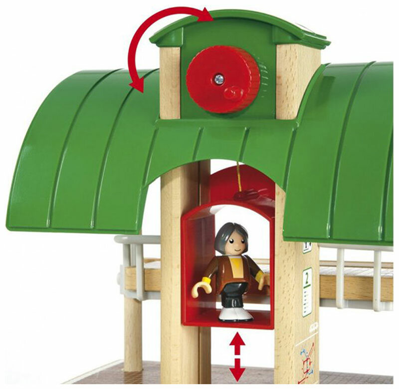Лучшие цены. Набор Деревянная железная дорога двухуровневая с вокзалом BRIO состоит из 42 элементов: железнодорожное полотно, управляемые стрелки, простые стрелки, машинисты, пассажиры и их багаж, пассажирский поезд, вокзал и подставки для второго уровня, а также арочный мост. Пассажирский мост оборудован лифтом, чтобы доставлять пассажиров на вокзал. Машинисты поездов могут быть размещены в кабинах поезда, а пассажиры с багажом - в вагонах. Все модели человечков имеют гнущиеся руки/ноги. Магазины в вашем городе.
