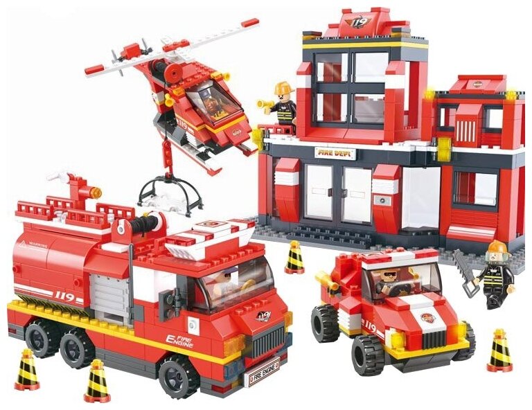 Лучшие цены. Внушительный конструктор от Sluban "Пожарные спасатели" обладает всем, что нужно настоящей пожарной бригаде. В набор входит пожарная станция с открывающимися стеклянными дверьми, вертолет с носилками, автоцистерна с водяной лафетной пушкой, штабной джип, шесть фигурок пожарных и различные инструменты: гаечный ключ, топор, молоток, лопата, пила. Конструктор не только способствует развитию внимания и мелкой моторики, но и знакомит ребенка со сложным процессом работы пожарной команды. Магазины в вашем городе.