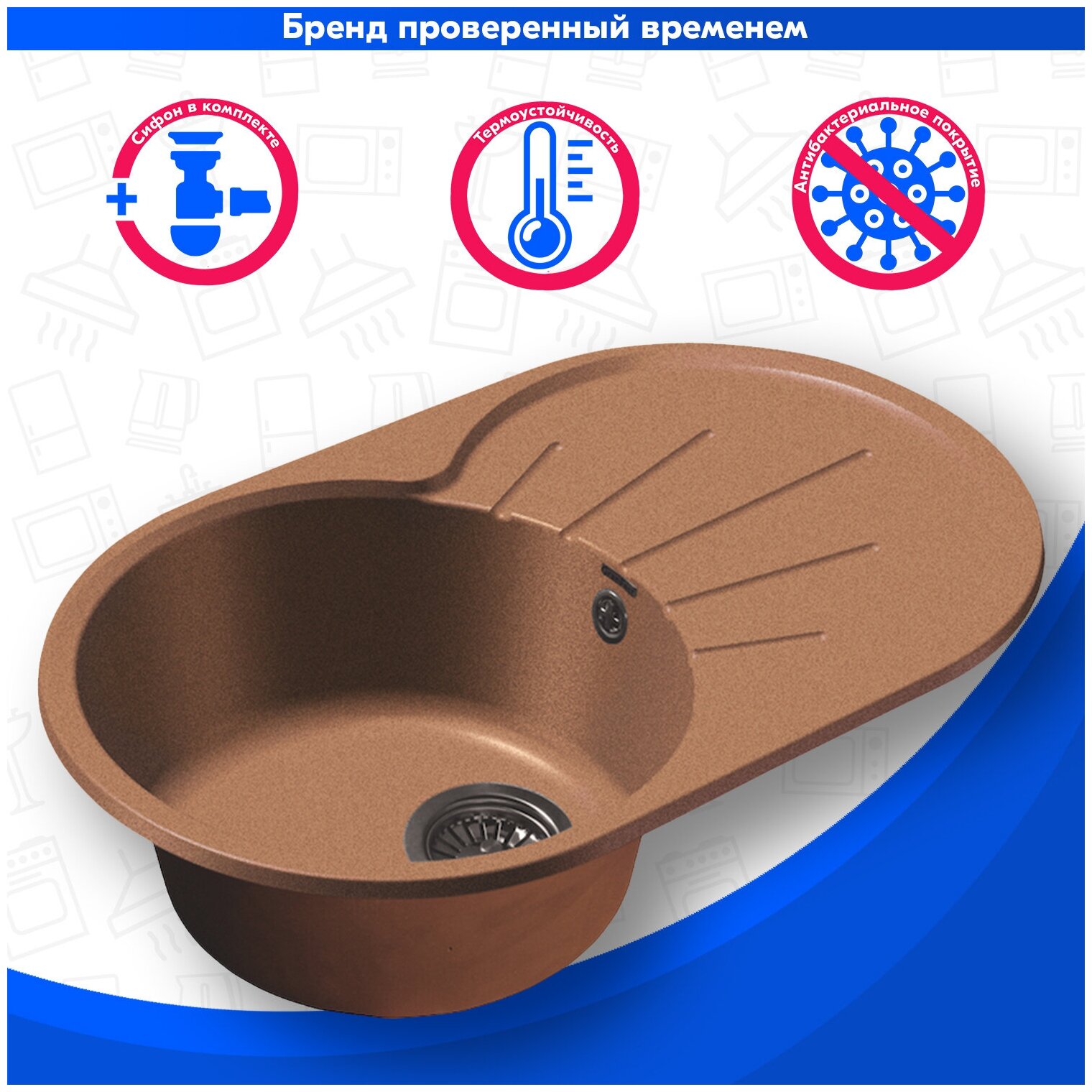 Кухонная мраморная мойка GranFest RONDO GF-R750L, овальная, оборачиваемая, врезная, с переливом, 750*460 мм, цвет топаз/Раковина для кухни