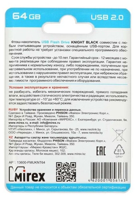 Лучшие цены. 64GB USB 2.0 Mirex KNIGHT чёрный (ecopack)(13600-FMUKNT64). Память USB Flash 64 ГБ Mirex Knight [13600-FMUKNT64] – это компактное решение емкостью 64 ГБ, благодаря которому вы сможете комфортно хранить и перемещать различные файлы – будь то документы или фото и видео. В основе этой модели применяются передовые технологии обработки и хранения данных, а также высококачественные электронные компоненты. Магазины в вашем городе.