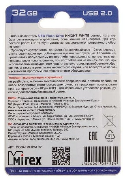 Лучшие цены. Флэш-накопитель 32 ГБ Mirex KNIGHT WHITE 32GB. Магазины в вашем городе.