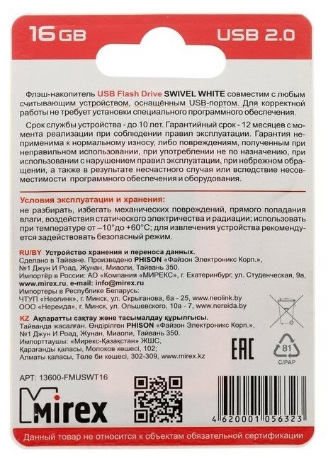 Флешка 16GB Mirex Swivel, USB 2.0, Белый 390 ₽ Подробнее