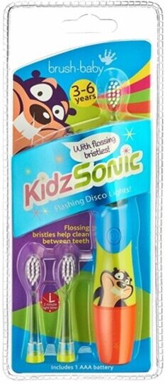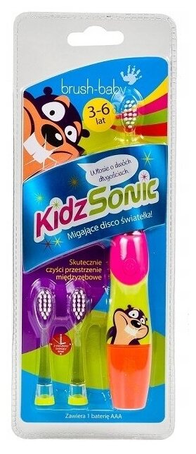 Лучшие цены. Детская электрическая звуковая зубная щётка Brush-Baby KidzSonic розового цвета создана специально для возраста от 3 до 6 лет. Чистящие головки обладают двухуровневой щетиной, которая одинаково эффективна как для обработки поверхности зубов, так и межзубных промежутков. Изделие имеет подсветку, мигающую разными цветами, а также двухминутный таймер, напоминающий ребёнку о необходимости продолжать сеанс. Каждые 30 секунд прибор сигнализирует вибрацией, когда пора сменить зону чистки. Магазины в вашем городе.