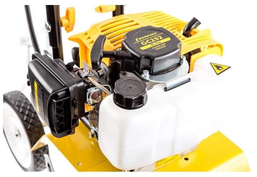 Лучшие цены. Культиватор бензиновый Champion GC 252 – компактный двухтактный агрегат повышенной мощности. При весе всего в 15 с лишним кг, он развивает почти 2 лошадиных силы. Двигатель выдает до 9300 оборотов в минуту. Передача крутящего момента производится посредством центробежного сцепления и червячного редуктора, который, в свою очередь, понижает обороты двигателя до рабочих 160 - 180 оборотов в минуту на фрезах. Магазины в вашем городе.