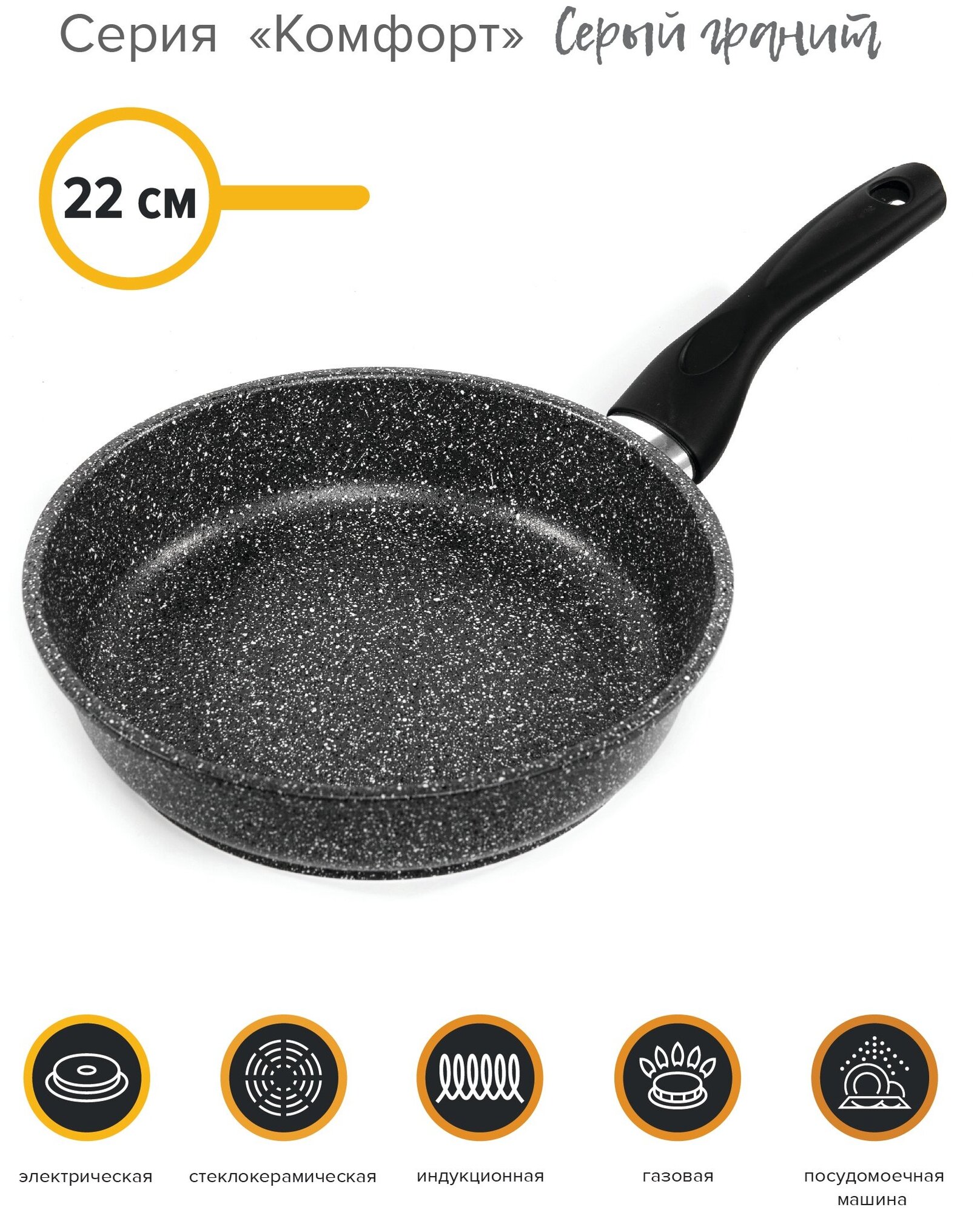 Сковорода а/п, литая, 22 см, Комфорт, сер. гранит, катюша, арт. 7122