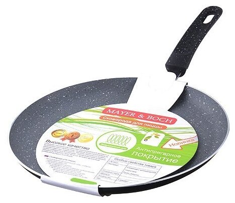 Лучшие цены. Блинная сковорода MAYER&BOCH выполнена из качественного алюминия и снабжена внутренним мраморным антипригарным покрытием. Антипригарное покрытие жаропрочное, является экологически чистым и полностью безопасным, без вредных соединений и примесей. За счет того, что пища не пригорает и не пристает к покрытию сковороды, сковороду легко и быстро мыть. Прочное индукционное дно сковороды устойчиво к повреждениям и деформации. Эргономичная ручка из бакелита не нагревается и не скользит в руках. Магазины в вашем городе.