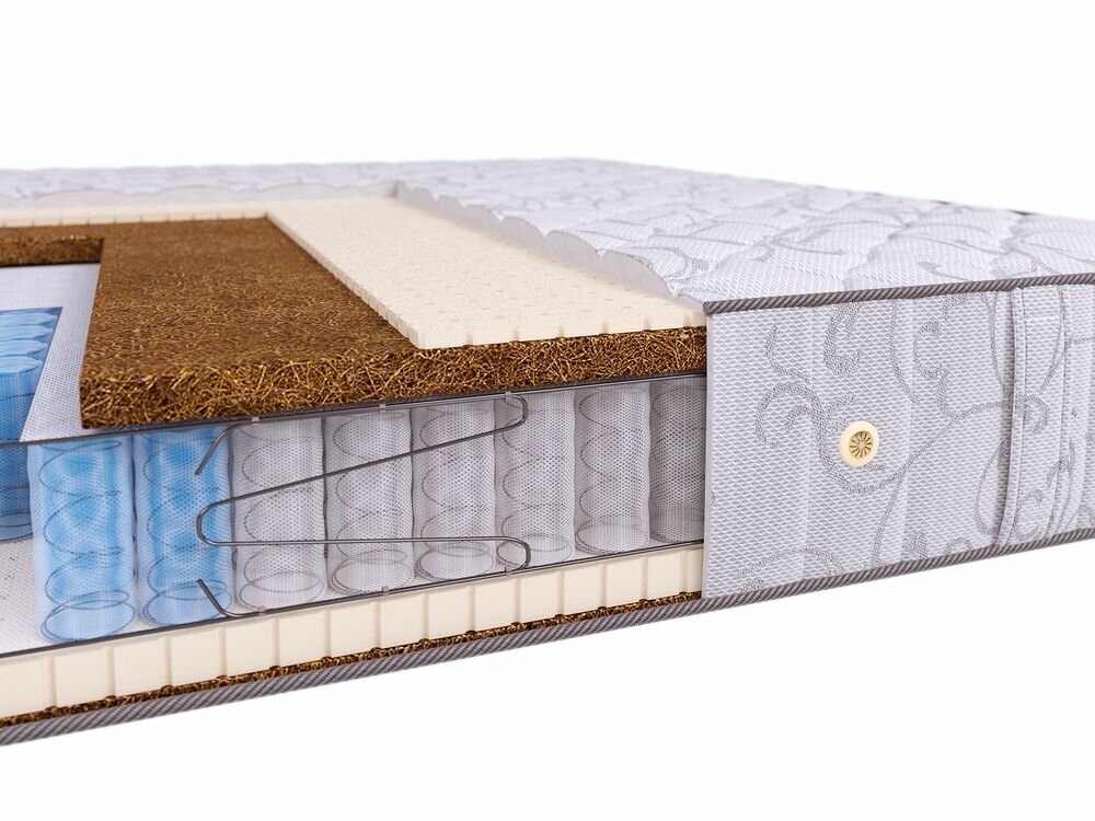 Лучшие цены. Пружинный матрас Hit Optima TFK+ разносторонней жесткости выполнен из натуральных материалов латексированной кокосовой койры и натурального латекса на независимом 5-ти зональном пружинном блоке «Покет 5 зон» (256 пр/м2) с усилением по периметру Z пружинами, который равномерно распределяется нагрузку тела и создает правильную поддержку позвоночника во время сна. Одна сторона средней жесткости, другая выше средней. Матрас выполнен из латексированного кокоса и мягко-упругого натурального латекса. Магазины в вашем городе.