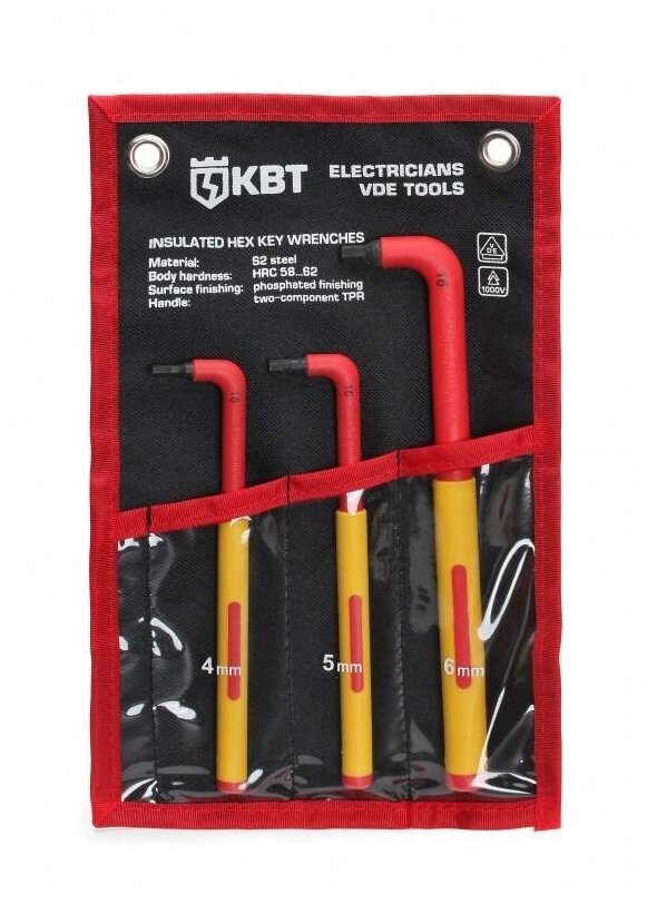 Лучшие цены. Серия профи Для работы под напряжением до 1000 В Набор диэлектрических имбусовых шестигранных ключей: 4, 5, 6 мм Твердость стержня: HRC 58…62 Материал стержня: сталь S2 Обработка поверхности: воронение Двухкомпонентные рукоятки с прорезиненным нескользящим покрытием Маркировка типоразмера и VDE-сертификации по IEC 609000 — на каждом ключе Прочная и удобная раскладная сумка с ремнем-липучкой и крепежными отверстиями под евростенды Вес набора: 327 г. Магазины в вашем городе.