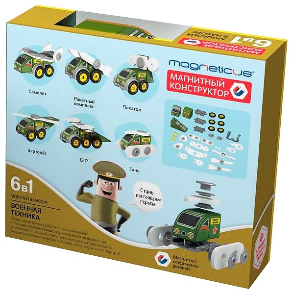 Лучшие цены. Магнитный конструктор "Военная техника" предполагает сборку 6-ти моделей: танка, вертолёта, локатора, БТР, ракетного комплекса и самолёта. Детали легко крепятся друг к другу благодаря встроенным магнитам. В процессе игры ребёнок будет развивать сенсорные навыки, логику и моторику рук. Магнитные кубики "Военная техника" позволят ребёнку узнать, с помощью какой техники военные держат границу на замке. Магазины в вашем городе.