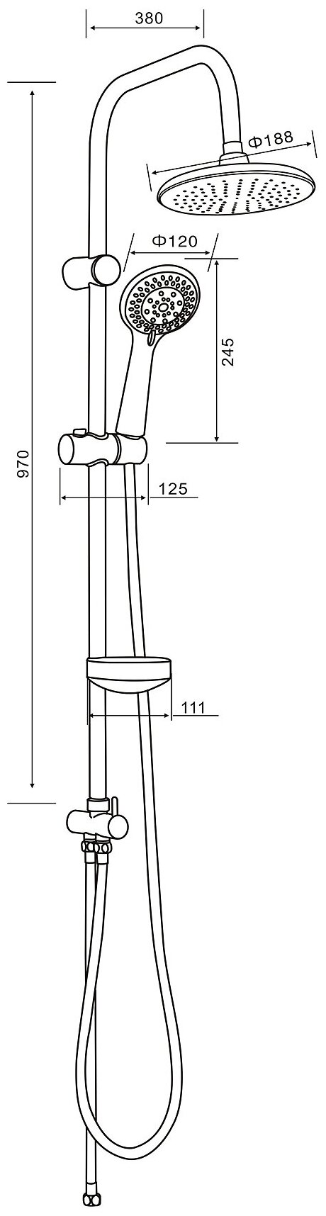 | Комплектация | ручной душ (душевая лейка) / верхний душ (тропический) / смеситель / стойка / штанга / душевой шланг / крепление ручного душа |