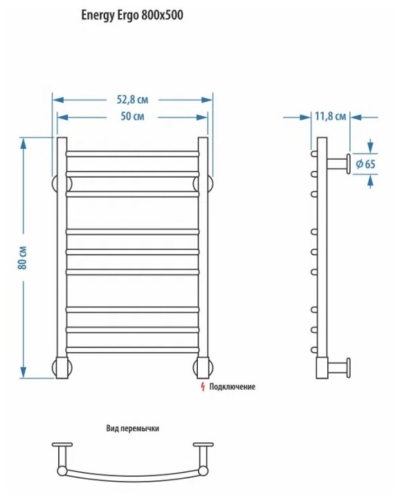 Лучшие цены. Energy Ergo 800x500 – электрический стационарный полотенцесушитель-лесенка с девятью выпуклыми перемычками круглого сечения, выполненный из высококачественной пищевой нержавеющей стали. Нагревательный элемент прибора - греющий кабель в изоляции из кремнийсодержащей резины. Может быть подключен как скрытым, так и наружным способом. Подключение производится через правую нижнюю стойку. Оснащён влагозащищенным выключателем с индикатором работы. Магазины в вашем городе.