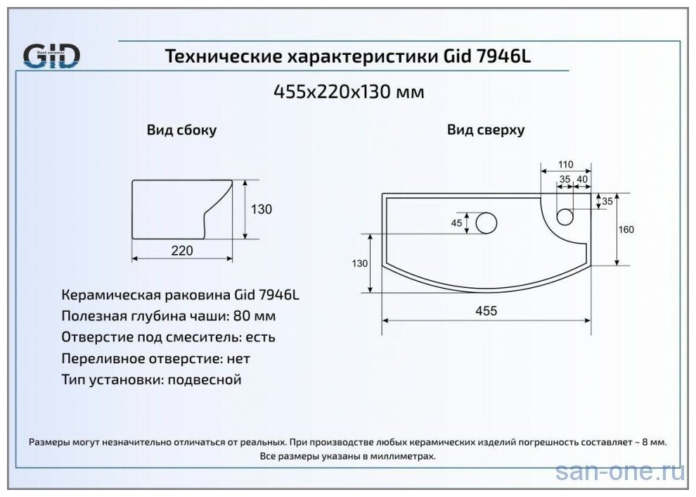 Раковина накладная GID 7946L 45.5 чаша слева/белая глянцевая 5 050 ₽ Подробнее