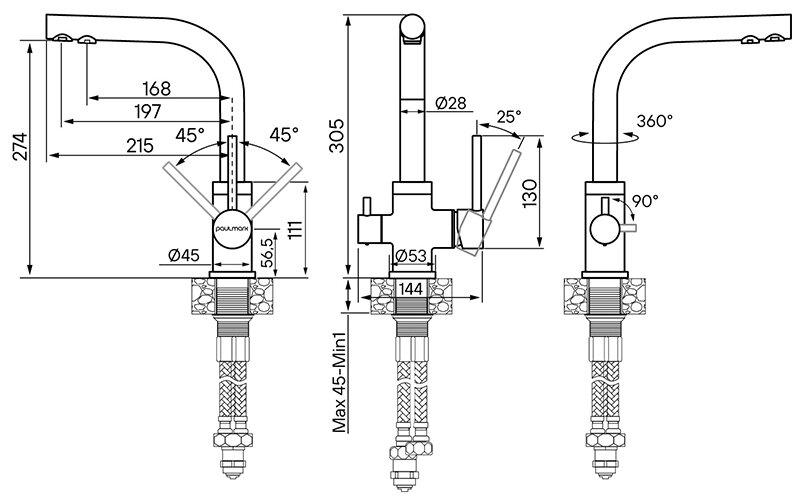 Смеситель для кухни Paulmark ESSEN, подключение к фильтру питьевой воды с отдельным каналом и выпуском, высокий поворотный излив, латунь, на мойку / столешницу, графит, Es213011-DG 16 500 ₽ Подробнее