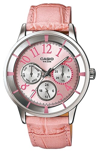 Лучшие цены. Женские наручные часы Casio LTP-2084L-4B2 кварцевые, элементом питания которых является батарейка. Корпус стальной с IP покрытием с розовым циферблатом и минеральным стеклом, которое не расколется от легкого удара, браслет - кожаный ремешок. Модель Casio LTP-2084L-4B2 обладает степенью влагостойкости 50 м (5 АТМ), где допустимо кратковременное погружение в воду, для плавания рассмотрите варианты от 100 м (10 АТМ). Циферблат подсвечивается люминесцентной подсветкой, позволяющей видеть время в темноте. Магазины в вашем городе.