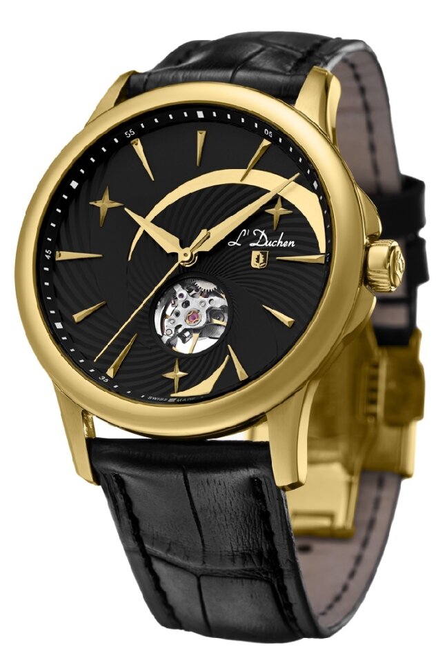 Лучшие цены. Мужская модель L'Duchen D 154.21.31 представлена из коллекции Supernova. Циферблат из серии Supernova демонстрирует новую технику декорирования. Иллюзия движения достигается использованием сложного рисунка Гильоше и накладных элементов из стали. В модели установлен Швейцарский механизм Soprod с функцией автоподзавода. Все элементы родированы, а открытый узел баланса инкрустирован рубином. Мост украшен зернением Perlage, ротор узором «Cotes de Geneve» (женевские полосы). Магазины в вашем городе.
