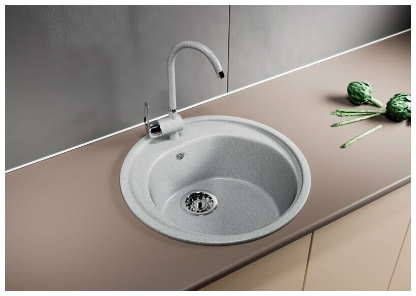 Лучшие цены. Монтаж: встраиваемая сверху, Материал: искусственный мрамор, Цвет: серый, Ширина, см: 50.5, Длина, см: 50.5, Глубина, см: 18, Асимметричность: нет, Поверхность: матовая, Стилистика дизайна: современный стиль, Ширина шкафа, см: 50, Монтажная ширина, см: 49, Монтажная длина, см: 49, Диаметр сливного отверстия, см: 8.89, Отверстия под смеситель: на 1 отверстие, Намеченных отверстий для смесителя: нет, Слив-перелив: есть, Клапан-автомат: нет, установка не предусмотрена, Форма: круглая, Число основных чаш: 1. Магазины в вашем городе.