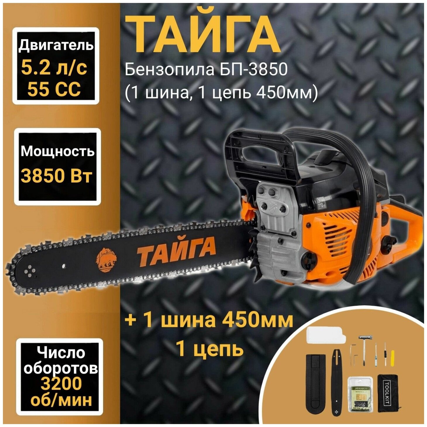 Пила цепная бензиновая Тайга БП-3850 (шина, цепь 450ммм) 3850Вт, 5,2 л.с, 3200об/мин