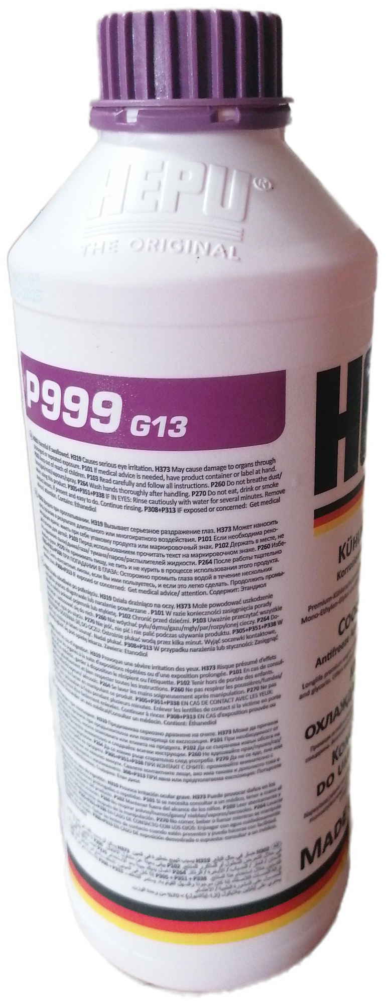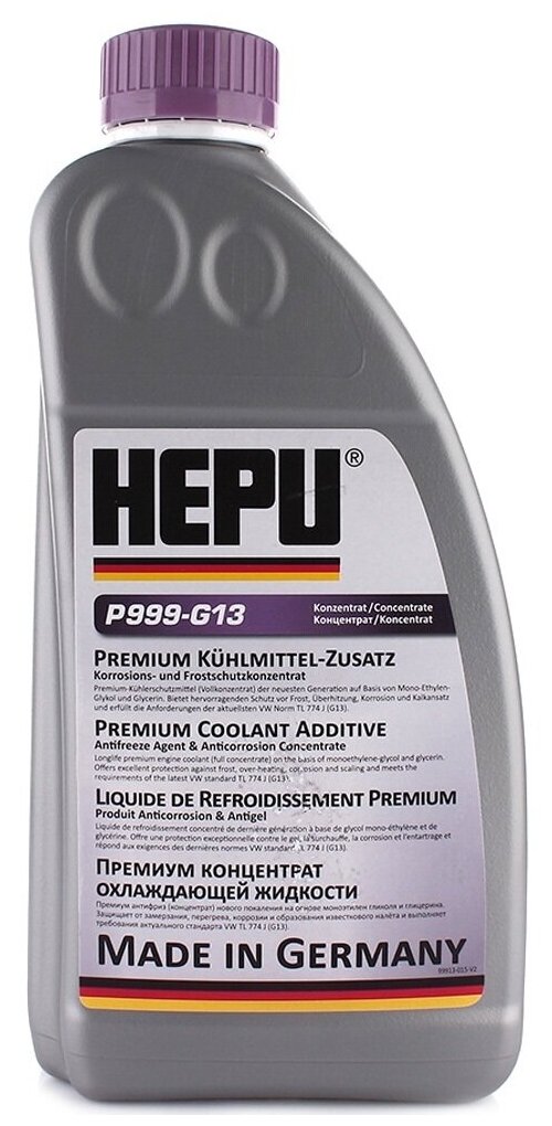 Лучшие цены. P999G13 Жидкость охлаждающая 1,5л (фиолетовая) концентрат (HEPU) Жидкость охлаждающая 1.5л. "G13", фиолетовая, концентрат P999G13 Жидкость охлаждающая 1,5л (фиолетовая) концентрат (HEPU) Температура замерзания -37C Индекс допуска VAG G-13, Допуски Audi/VW G13 / TL 774-J, ASTM D3306/D4985, Audi/Seat/Skoda/VW G 013 A8J M1, SAE J1034. Магазины в вашем городе.