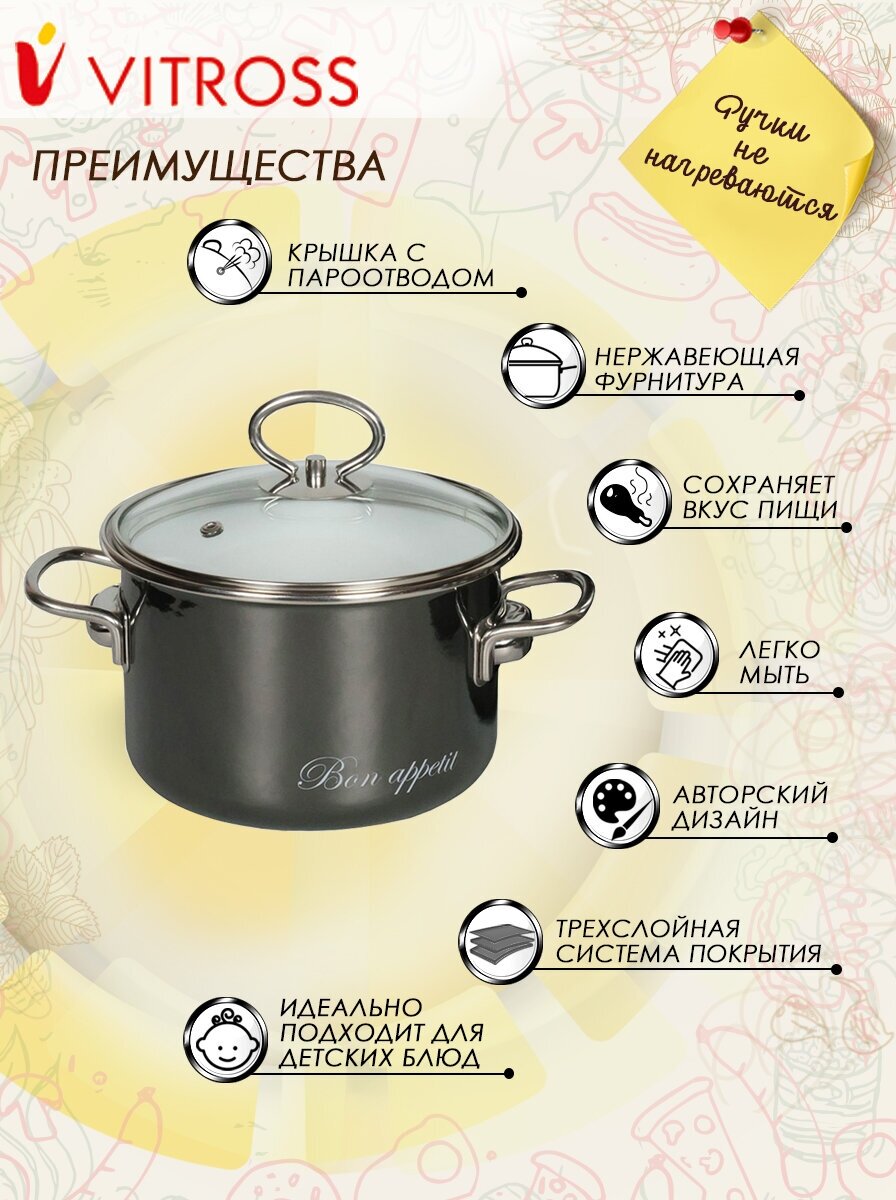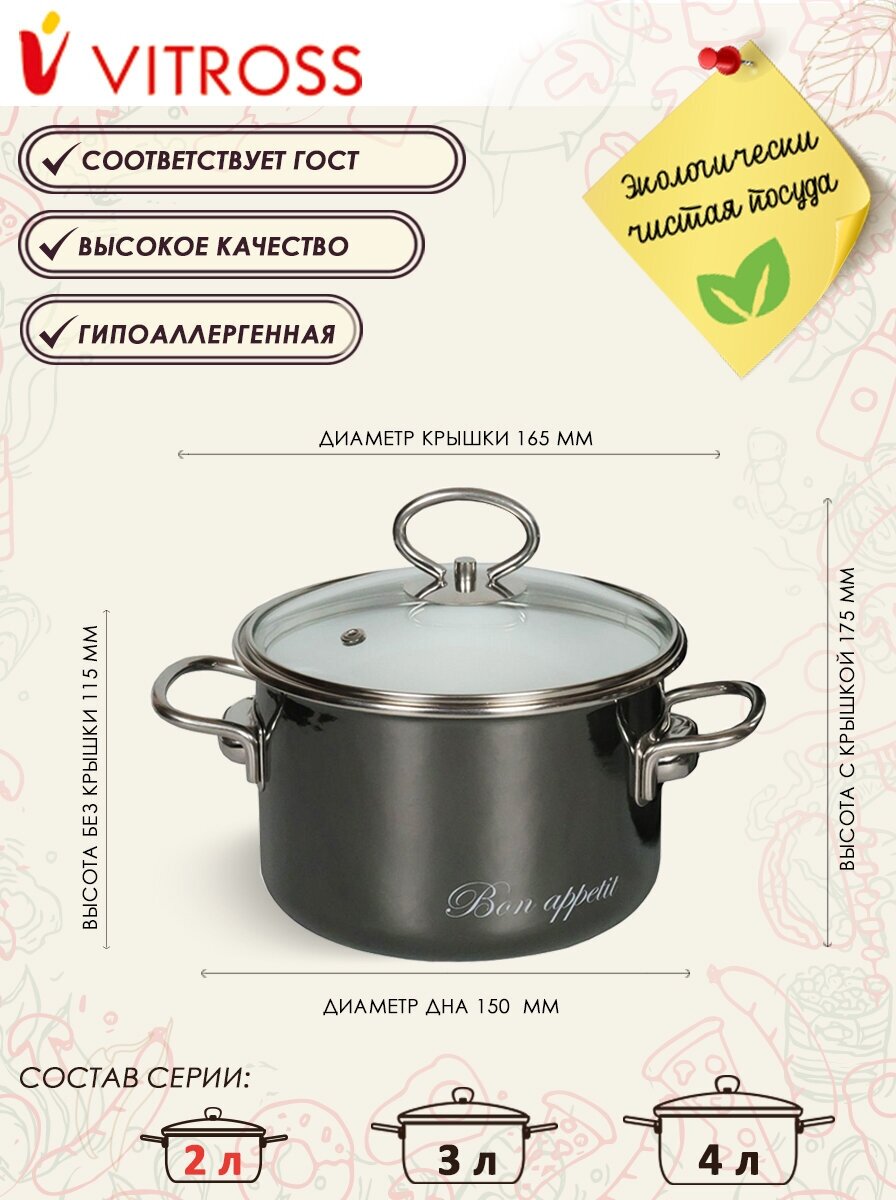Кастрюля Кастрюля сталь, эмалированное покрытие, 2 л, с крышкой, Vitross, Bon Appetit, 8SD165S/8SB185S, мокрый асфальт