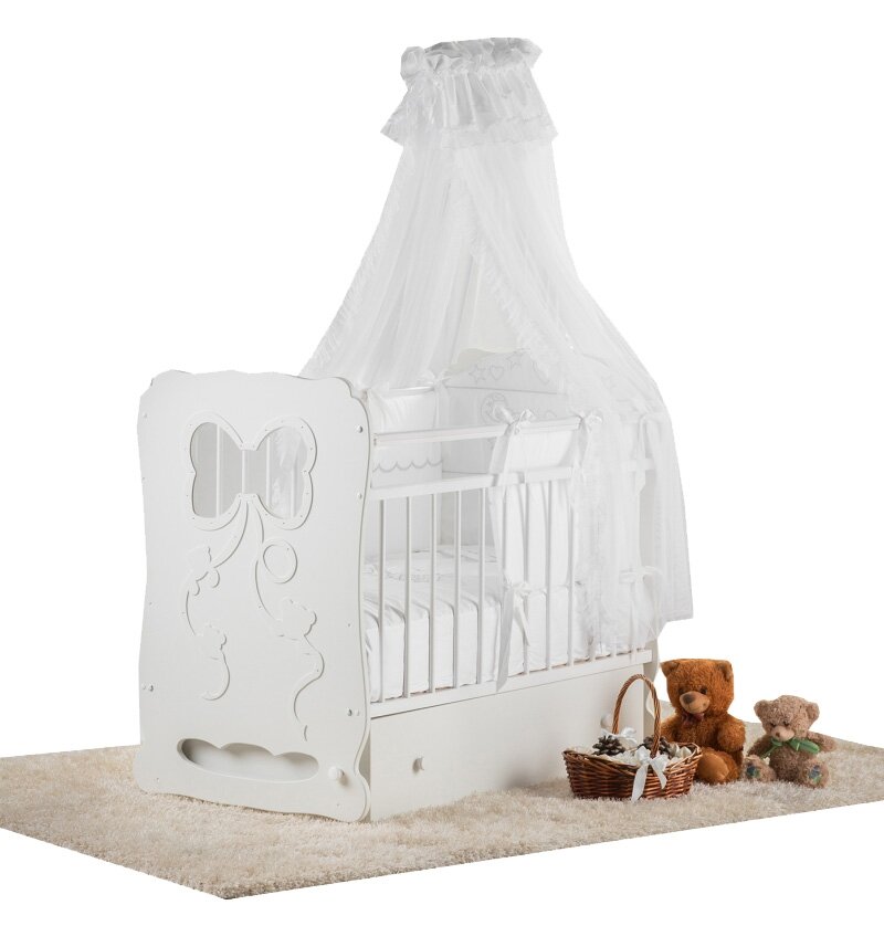 Лучшие цены. Детская кроватка изготовлена из качественной древесины и покрыта безопасным для здоровья лаком на водной основе. Спинка украшена резьбой. Для укачивания малыша предусмотрен поперечный маятник. При необходимости его можно зафиксировать. Под кроватью имеется ящик, в который можно сложить вещи первой необходимости – пеленки, подгузники и т.д. В комплекте: - кровать. Магазины в вашем городе.