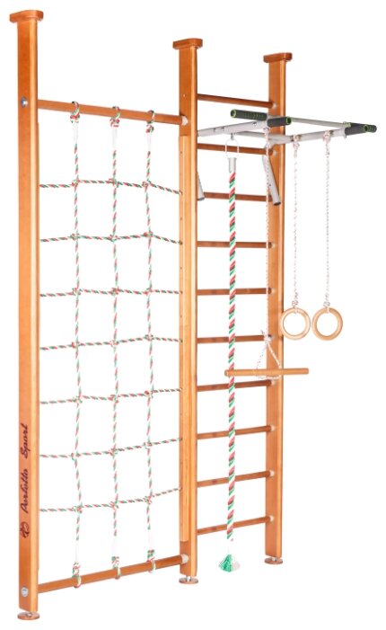 Лучшие цены. Крепление: враспор между полом и потолком. Высота: не более 2,66 м. Занимаемая площадь: 1,75 х 0,63 м. Допустимая нагрузка: 130 кг, на навесное оборудование 50 кг Комплектация: шведская стенка разборная, турник стационарный с неопреновыми ручками, кольца гимнастические деревянные, тарзанка, канат, стойка с сеткой . Масса комплекса: 30 кг. Магазины в вашем городе.