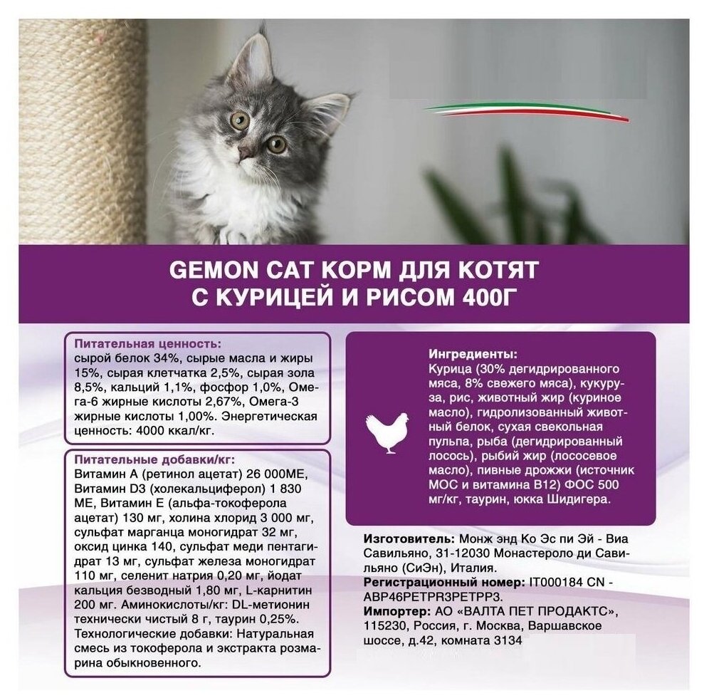 Сухой корм для котят Gemon с курицей, с рисом 400 г, срок 05.23г.