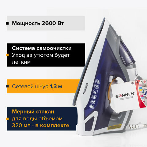 Утюг SONNEN SI-240 2600 Вт керамическое покрытие антикапля антинакипь фиолетовый, 1 шт