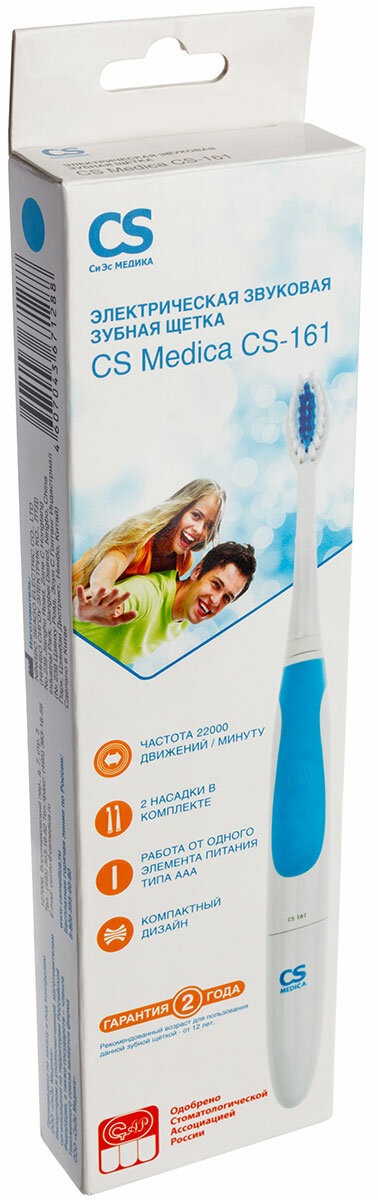 Лучшие цены. Электрическая звуковая зубная щетка CS Medica CS-161 (голубая) Компактная и легкая. Зубные щетки CS Medica позволяют бережно очищать зубной налет, не травмируя эмаль зубов. Достаточно, чтобы насадка слегка касалась поверхности зубов. Ворсинки щетки, совершающие микродвижения со звуковой частотой, не только участвуют в чистке зубов, но и тщательно массируют десны, тем самым усиливая микроциркуляцию крови, что является хорошей профилактикой заболеваний десен. Магазины в вашем городе.