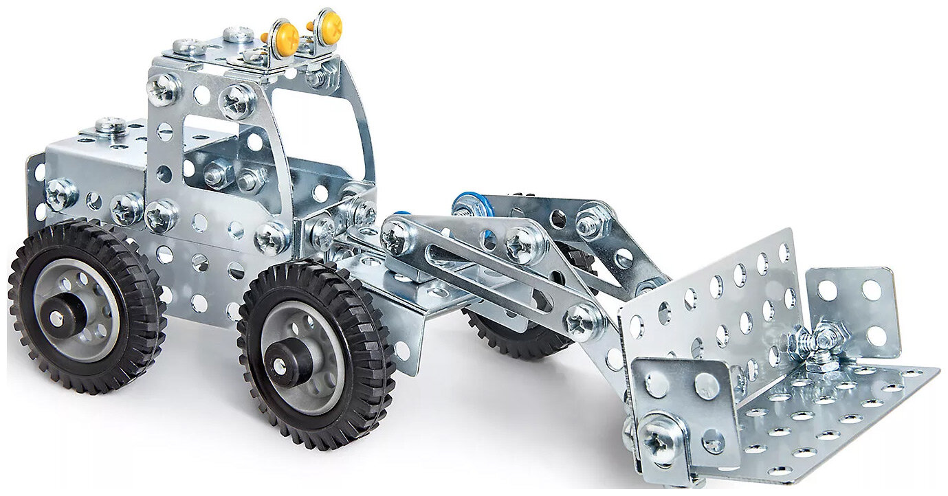 Лучшие цены. Этот конструктор изготовлен из стали высокого качества. Страна изготовления Германия. Он состоит из 160 деталей, с помощью котороых можно собрать строительную технику 3 видов, одним из которых является колесный погрузчик. В процессе конструирования у ребёнка хорошо работает 3D мышление и развиваются творческие способности. В комплекте помимо деталей есть необходимые для сборки болты и гайки и инструмент, чтобы их скреплять. Магазины в вашем городе.