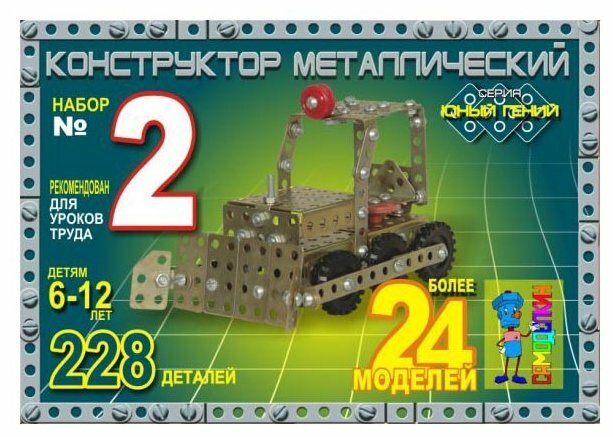 Лучшие цены. Металлический конструктор "Юный гений № 2 " состоит из 228 деталей. Он предназначен для конструирования как самостоятельно, так и на уроках труда. Ребенок может сам или при помощи взрослого собрать 23 модели различных видов машин и техники. Очень увлекательное и кропотливое занятие займет ребенка на не один час, потому что игра с металлическим классическим конструктором была интересной для мальчиков во все времена. Магазины в вашем городе.