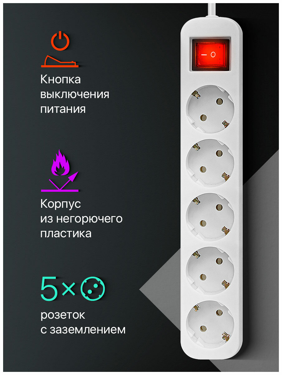 Лучшие цены. Удлинитель на 5 розеток с заземлением. Простой и надежный бытовой удлинитель, который предназначен для электроприборов и использования внутри помещений. Подходит для дома, офиса и коммерческих помещений. 10004; Предусмотрена возможность крепления на стену. 10004; Длина провода 5 м. 10004; Мощность 2200 Вт. Максимальный допустимый ток 10А. 10004; Корпус из негорючего пластика. 10004; Индикатор сети. 10004; Выключатель питания. Магазины в вашем городе.