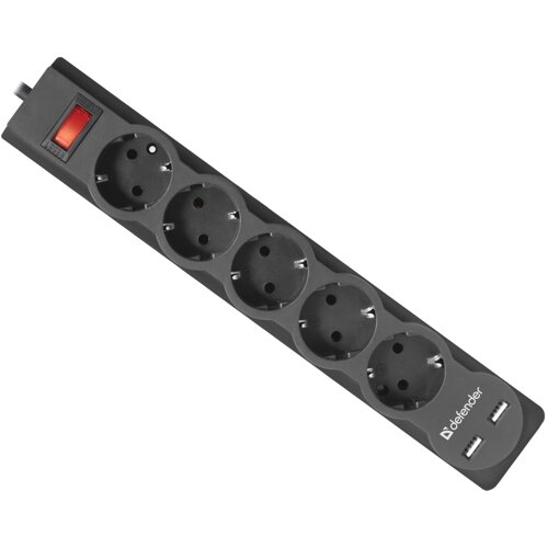 Сетевой фильтр Defender ES 5,0 м, черный, 5 розеток, 2xUSB, 2.1A