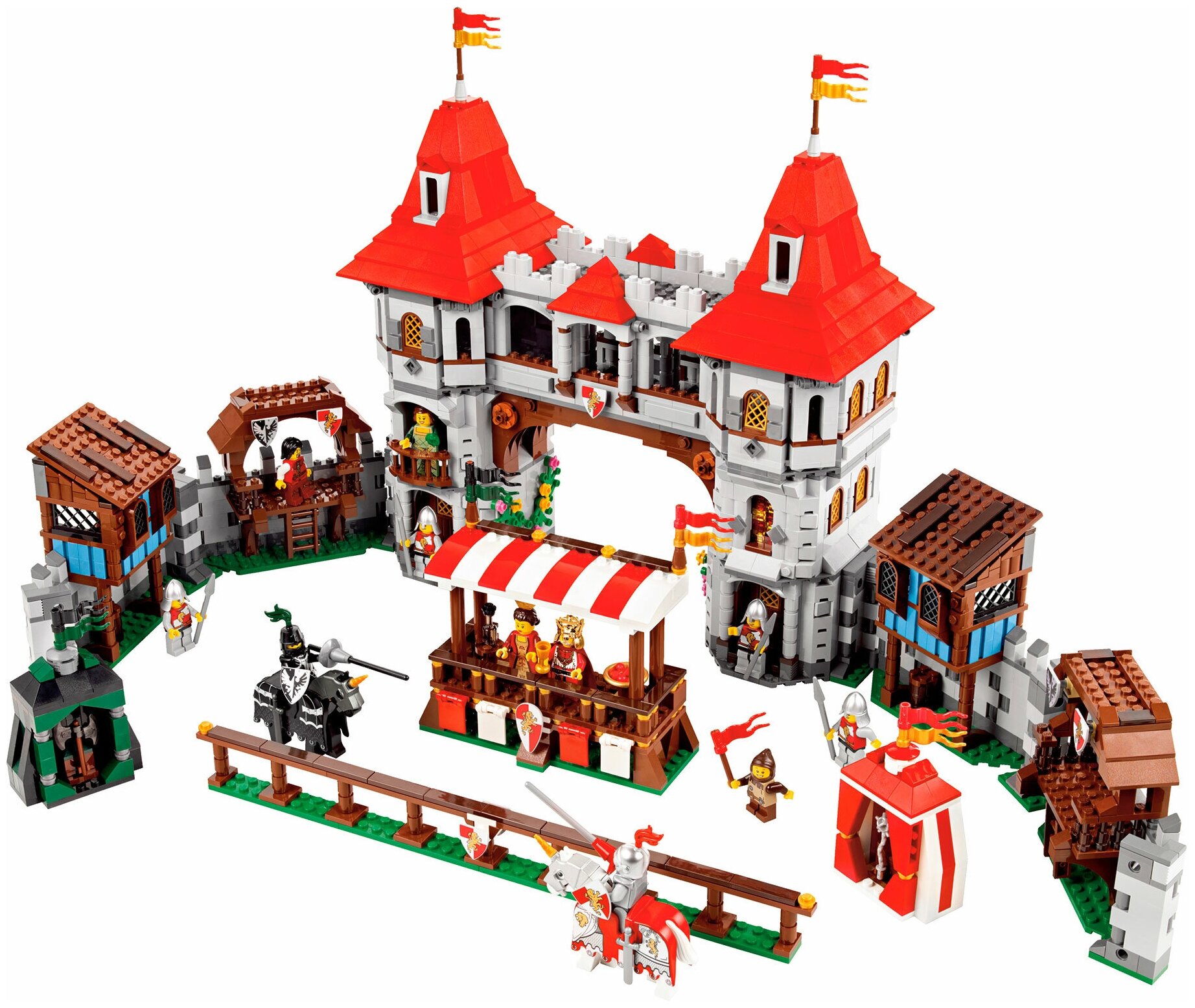 Лучшие цены. Замок из набора Лего 10223 отлично детализирован и состоит из 6 комнат. Тут можно найти королевскую библиотеку, столовую и дамскую комнату. Две башни соединены балконом, с которого открывается чудесный вид на площадь.У входа в каждую из башен дежурит вооруженный солдат. Перед дворцом поставлено 2 шатра для рыцарей. Первый рыцарь из королевства Льва и носит красные и жёлтые цвета. А другой приехал на турнир из королевства Сокола и носит мрачные чёрно-серые одежды. Магазины в вашем городе.