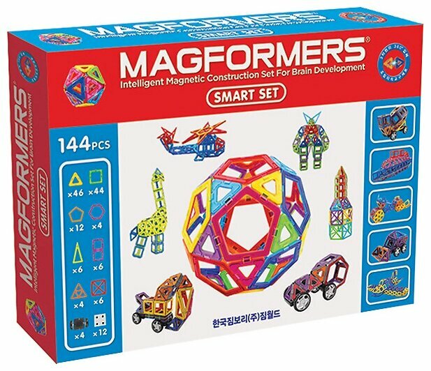 Лучшие цены. Набор «Magformers Smart Set» — отличный большой набор. Он практически полностью состоит из магнитных деталей, что дает огромный простор для детского творчества, плюс содержит самый нужный аксессуар — колеса. В наборе 144 элемента, в том числе магнитные детали обычного и супер-размеров, аксессуар колеса и блоки-вставки. Такое количество деталей позволяет собрать огромное множество моделей, от простых построек для детей помладше до сложнейших больших конструкций для ребят более старшего возраста. Магазины в вашем городе.