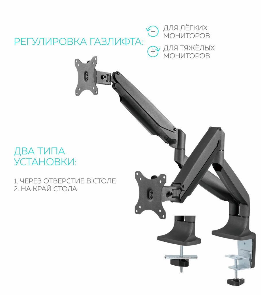 Кронштейн для 2 мониторов ONKRON/ 13-32 газлифт макс 100*100 наклон -90?/+90?, поворот +-90°, 2 колена, вылет от стены до 525мм, крепление к столу 10- 10 530 ₽ Подробнее