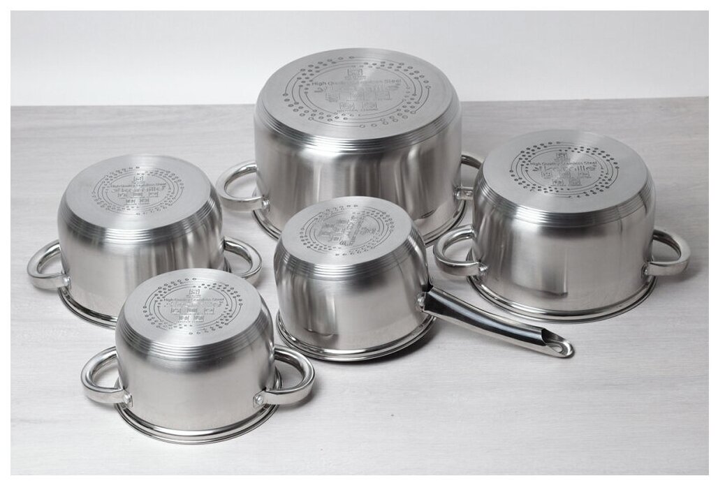 Набор посуды 10 предметов (ковш 1.8л; кастрюли 1.8л, 2.5л, 3.8л, 5.8л; полые ручки) из нерж. стали