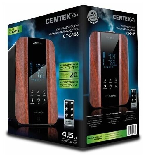 Лучшие цены. Увлажнитель воздуха Centek СТ-5106 мощностью 40 Вт заключен в корпус, выполненный в ретро-дизайне с имитацией натурального дерева. При этом устройство призвано создавать оптимальные условия для нахождения в помещении площадью до 20 кв.м. Компактный увлажнитель предназначен для настольной установки и вмещает до 4.5 л воды в бак. Расход ее при этом составляет не более 350 мл/час при максимальных настройках, регулировать этот параметр пользователь может на свое усмотрение. Магазины в вашем городе.