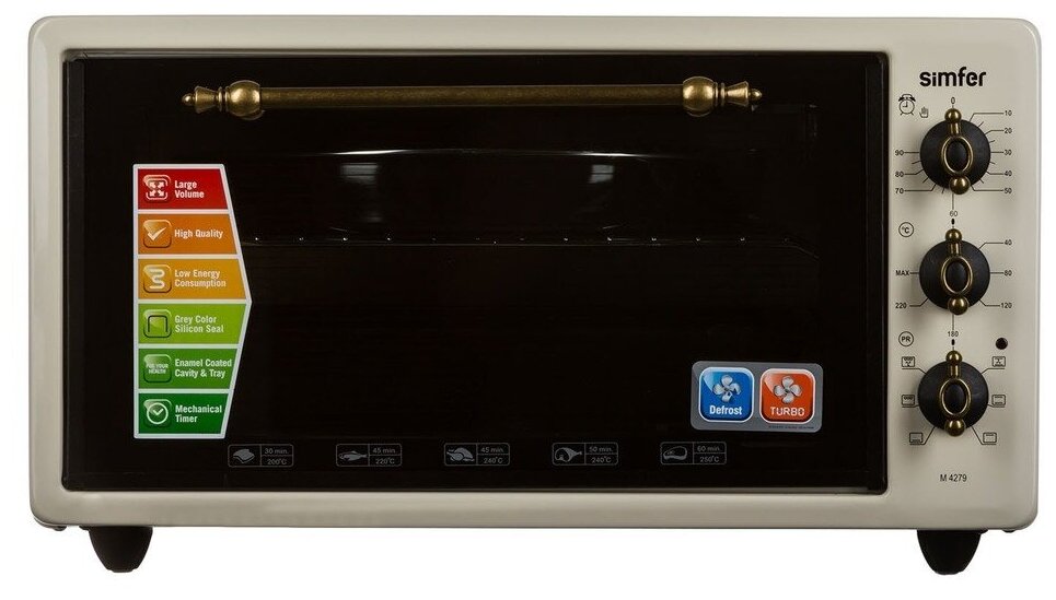 Лучшие цены. Электрическая Мини печь — Simfer M4279 - это духовка компактного размера, которая с успехом заменит традиционную на небольшой кухне или даче и прекрасно подойдет для приготовления овощных, рыбных, мясных блюд или ароматной выпечки. Благодаря разнообразным режимам вы сможете воплотить свои кулинарные фантазии. С помощью режима верхнего нагрева, продукты покрываются аппетитной и хрустящей корочкой, а режим конвекции позволит вам использовать с максимальной эффективностью весь объем духового шкафа. Магазины в вашем городе.